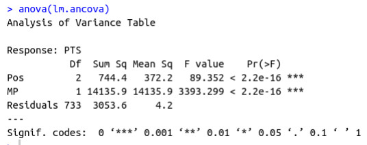 如果在回归中添加一个连续的特征,那么就会变成协方差分析(ANCOVA)。进行协方差分析的目的是,已知位置与NBA球员的PPG相关性大,但是这可能只是因为某些位置的球员比其他位置的球员的上场时间更多。