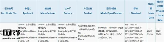 型号为PDKM00、 PDKT00的OPPO 5G数字移动电话机现已通过3C认证。申请人、制造商与生产厂均为OPPO广东移动通信有限公司,首次发证日期为3月30日。