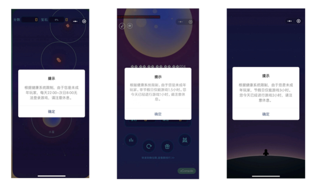 验证为未成年人的小游戏用户将受到游戏时段和游戏时长的限制:每日22时至次日8时,未成年人用户将无法使用小游戏服务,法定节假日未成年用户游戏时长每日累计不得超过3小时,其他时间每日累计不得超过1.5小时。
