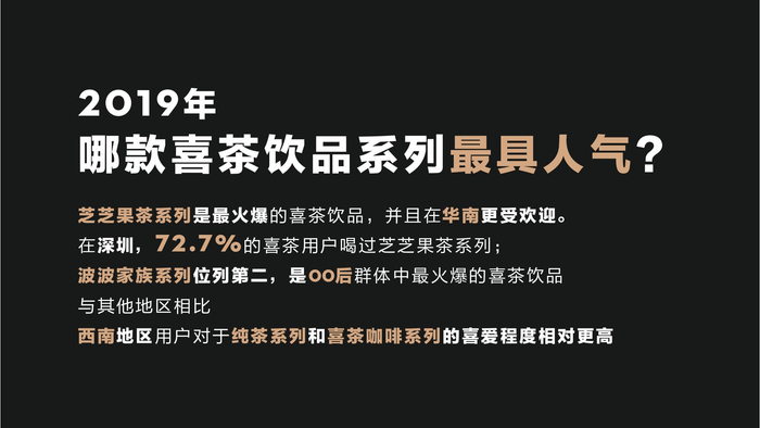 用户调研显示,2019年,芝芝果茶系列是最火爆的喜茶饮品,有60.0%的喜茶用户喝过,还有41.1%的喜茶用户最常喝该系列。从地区和城市来看,相对其他地区,芝芝果茶系列在华南地区更受欢迎;其中,深圳喜茶用户喝过芝芝果茶系列的占比高达72.7%。波波家族系列的人气位列第二,有49.8%的喜茶用户喝过。数据还发现,波波家族系列是最具“童趣”的饮品系列,用户年龄越低、波波家族系列的人气越高。有59.2%的00后喝过波波家族系列,该系列也是00后群体中最火爆的喜茶饮品。