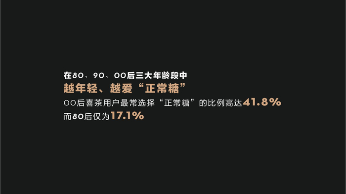 甜度方面,“少糖”以略微优势超过“正常糖”成为2019年喜茶用户最多选择的糖度。在80、90、00后三大年龄段中,越年轻、越爱“正常糖”,00后喜茶用户最常选择“正常糖”的比例高达41.8%,而80后仅为17.1%。