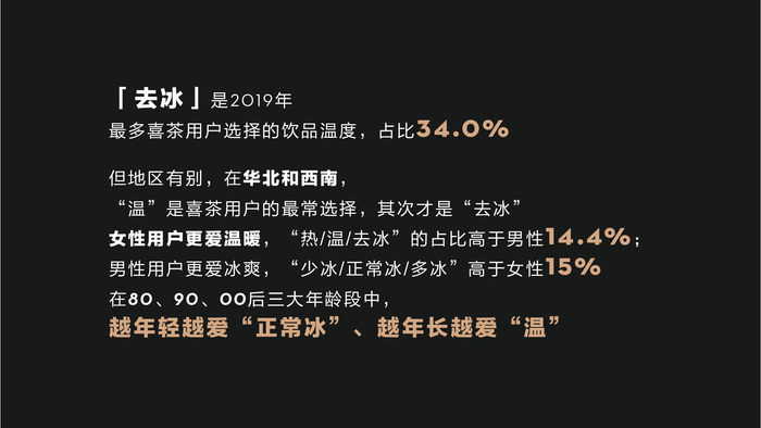 从性别看,女性用户喝过芝芝果茶系列和波波家族系列的比例高于男性,而男性用户喝纯茶系列和喜茶咖啡系列的比例高于女性。温度和甜度怎么选?温度方面,“去冰”是2019年最多喜茶用户选择的饮品温度。但地区有别,在华北和西南,“温”喜茶用户的最常选择。在80后、90后、00后三大年龄段中,越年轻越爱“正常冰”、越年长越爱“温”。