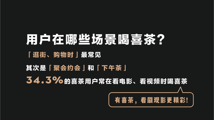 调研数据显示,从消费时间来看,14-16点是用户最常喝喜茶的时间段,有46.4%的喜茶用户在此时间段喝喜茶,还有接近2成的喜茶用户曾在20-24点喝过喜茶。从消费场景来看,“逛街、购物时”最常见,占比67.8%;其次是“聚会、约会时”和“下午茶”;34.3%的喜茶用户常在看电影、看视频时喝喜茶。