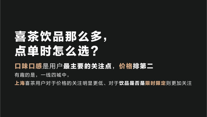 用户在选择喜茶饮品时的关注点是什么?调研数据显示,口味口感是用户最主要的关注点,远超其他因素。其他的关注点依次还有价格、热量和健康程度、这款饮品的人气口碑等。在北上广深中,上海的喜茶用户对于价格的关注明显更低、对于饮品是否是限时限定则更加关注;北京的喜茶用户对于饮品的外在颜值更加看重,对于内在原材料搭配的创意、相对没那么关心。不同星座,关注点也有差别。水象星座似乎更有主见,在选择喜茶饮品时对于人气和口碑的关注更低;土象星座对于健康和热量的关注则偏低、要喝就喝个痛快。