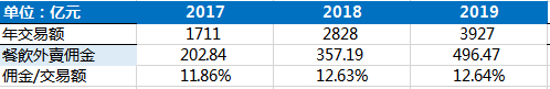 36氪整理发现,美团2019年总交易金额为6821亿元,来自餐饮外卖的交易额为3927亿元。倘若粗暴地将外卖佣金/外卖交易额的值作为佣金费率参考,得出2019年平均外卖费率为12.64%,对比2018年该项数据为12.63%,相差不大,2017年则为11.86%。