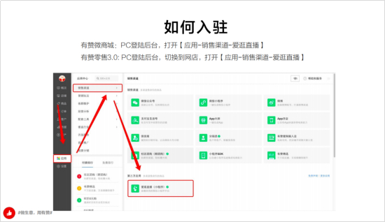 据有赞方面介绍,商家可在有赞微商城或有赞零售后台通过“应用-销售渠道-爱逛直播”路径,免费开启爱逛直播。