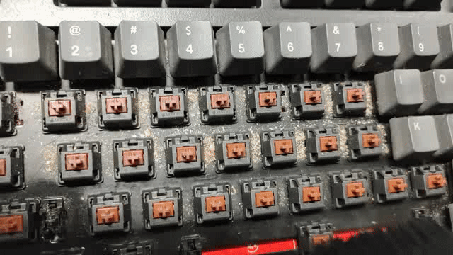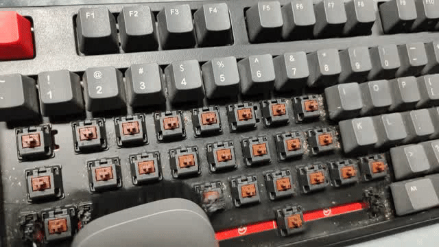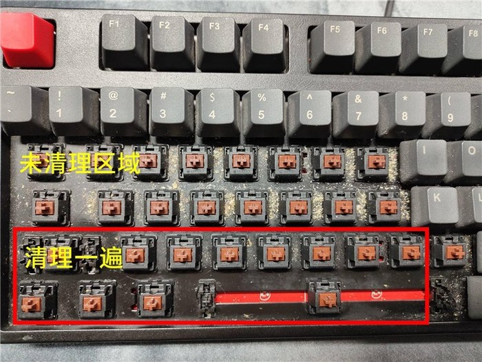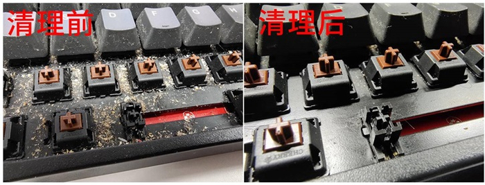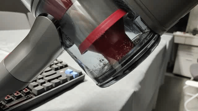 首先,笔者用毛刷吸头对键盘进行清扫测试。要说明一点的是,笔者的机械键盘已经使用三年多的时间,在三年多的时间里,笔者从未主动清理过键盘,可想而知这三年的时间里键盘内藏了多少的污垢。打开键盘之后,眼前的景象果然是不忍直视,各种发屑、灰尘几乎铺满了键盘内部。H6通过毛刷吸头将键盘内部发屑、灰尘等垃圾刷掉的同时,设备产生的吸力瞬间将垃圾吸附到了尘盒内部,来回刷4-5遍就能将键盘清理干净。