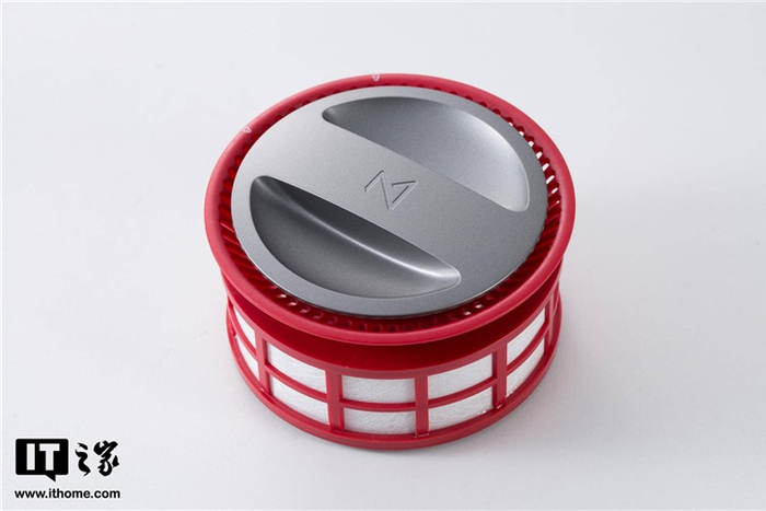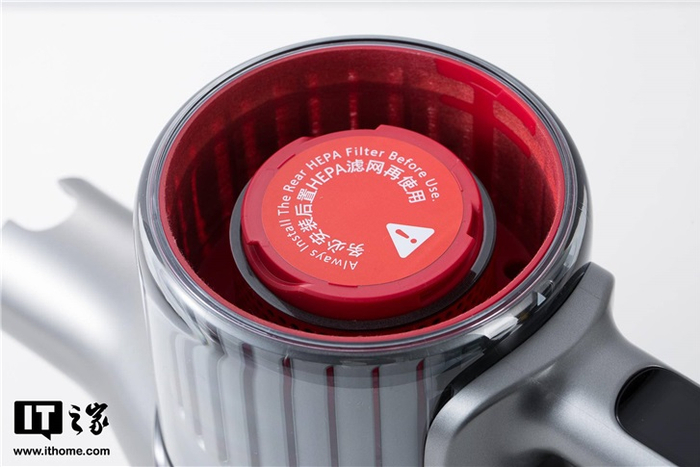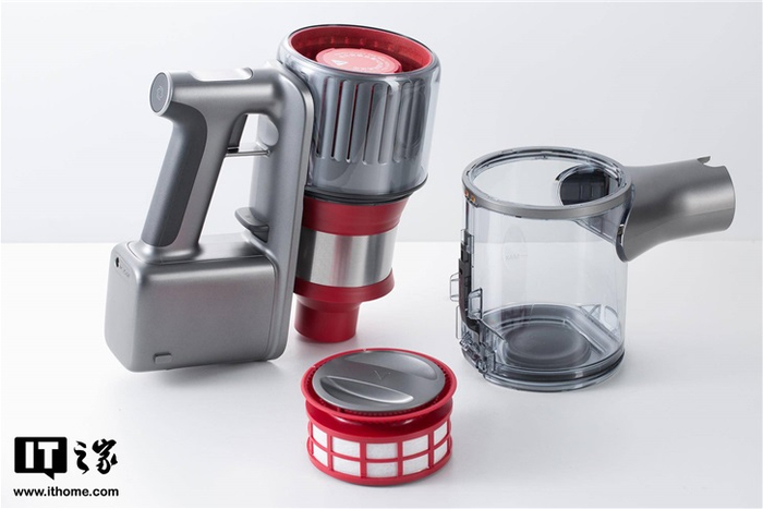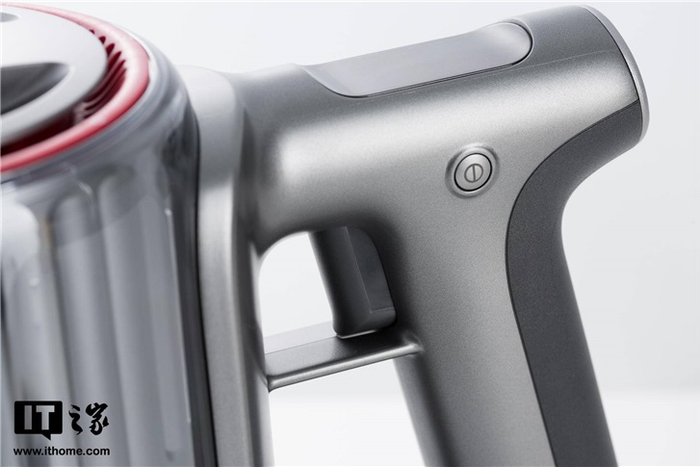 产品整体以大面积的科技灰配色为主,机身中部采用了透明工艺,使内部结构外化,尘桶内部以及顶部的过滤系统采用了红色点缀,起到了设计上的点睛之笔,使得产品的质感更强。