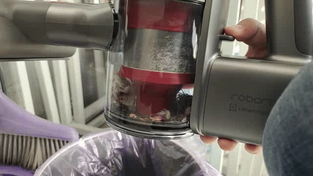 上图这个印有垃圾桶标识的按钮为倒尘开关,向下按压即可倾倒灰尘。