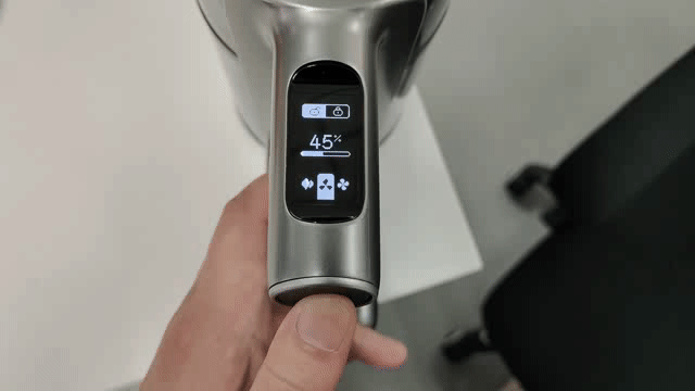 手柄位置上方是一块OLED 显示屏,可显示电量、风速、清洁模式、工作状态等等,当滤网需要清理时,OLED屏幕可以智能提醒,并演示保养方法。
