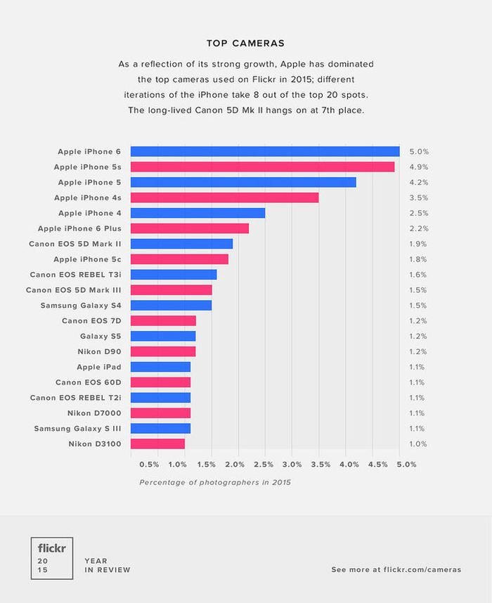 有一个有趣的数据是,在 Flickr 于 2015 年发布的「用户最常用相机」中,iPad 排在了榜单第 15 名,虽然远低于同期占榜前五名的 iPhone,但距离最近的 Galaxy S5 也只有 0.1% 的差距。