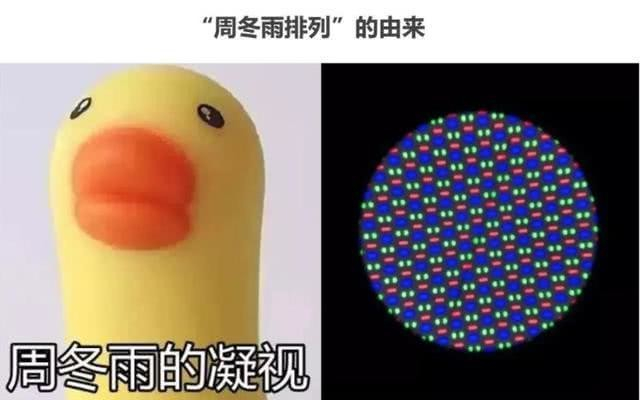 国内像京东方的OLED屏幕采用“周冬雨排列”(看起来像一只只小鸭子表情,被网友们称“周冬雨排列”),其显著的特点便是特点就是绿色子像素被分割成两个小部分,这种像素排列方式的 RGB 三色的子像素数量是相同的,但是三种颜色的像素点各减少了三分之一,六个子像素共用周围的一个像素,因此实际分辨率更低了,分辨率低的情况下边缘锯齿就比较明显。