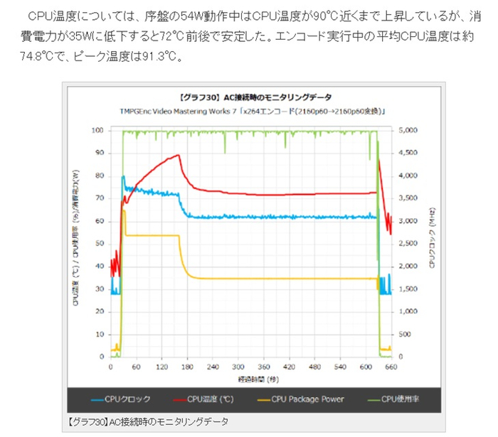 在刚开始的54W时,CPU的温度上升到90℃附近,稳定到35W时温度在72℃左右,编码运行的平均CPU温度约为74.8℃。