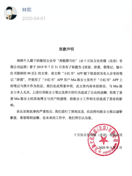 昨天,原公众号“美貌研习社”所属公司“十万加文化传媒(北京)有限公司”公开发表道歉声明,并向名誉受损的用户赔偿经济损失和律师费总计7万元。