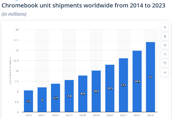 一提到谷歌,作为中国消费者,最容易想到的就是手机的安卓系统,其实针对笔记本电脑行业,谷歌也有自己的操作系统Chrome OS,虽然国内使用的人不多,但在海外是不容小觑的力量,和微软的Windows ,苹果的Mac OS,三分天下。Chroombooks需要在网络环境下使用,利用云空间存储资料,因此对硬件性能要求不高,可以做到轻薄,低价,广受美国和加拿大学生群体、程序员和办公人员的欢迎。根据Statista的数据统计,预计2023年全球将卖出1700万台chromebook。