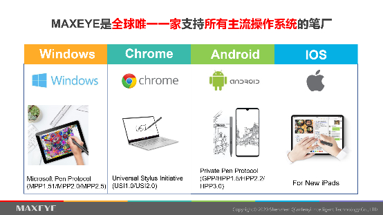 2020年1月份美国拉斯维加斯电子展上,整机品牌厂商华硕(ASUS)正式发布Chromebook Flip C436,主动笔厂商MAXEYE助力ASUS量产全球第一支支持chrome OS的USI协议笔,市场引起巨大反响,谷歌的战略终于可以实际落地,有产品面向终端消费者。