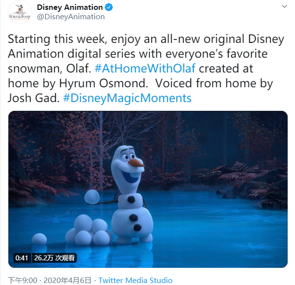 目前还不知道迪士尼会推出多少集Olaf短片,但迪士尼动画公司在推特上发布了这40秒的短片,得到了粉丝们的热情回应。