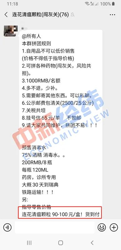 目前,部分海外华人留学生开始进行抗疫物品的“团购”,然而价格也水涨船高,连花清瘟颗粒从1000元/15盒涨到90-100元/盒,并且“风险共担”不承诺到货。