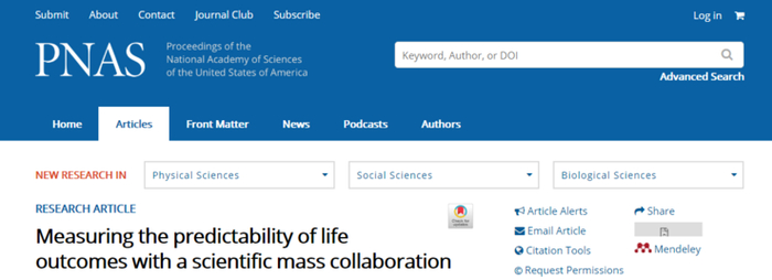 当地时间 2020 年 3 月 30 日,这一挑战赛的研究成果在线发表于《美国国家科学院院刊》,论文题为 Measuring the predictability of life outcomes with a scientific mass collaboration(通过科学合作探究人生轨迹的可预测性),合著者多达 112 位。