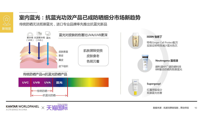 天猫国际联合凯度消费者指数发布《解码中国消费者新防晒时代》报告,防晒市场向新场景、新功能、新形态、新人群四大方向发展,抗蓝光、补水保湿、抗老、抗污染等防晒细分需求涌现。