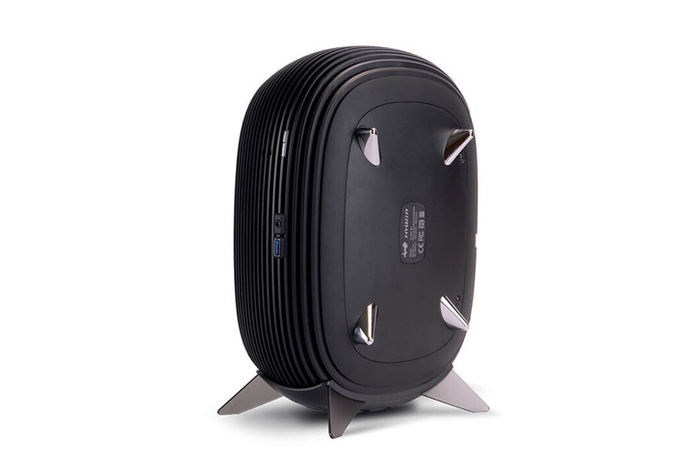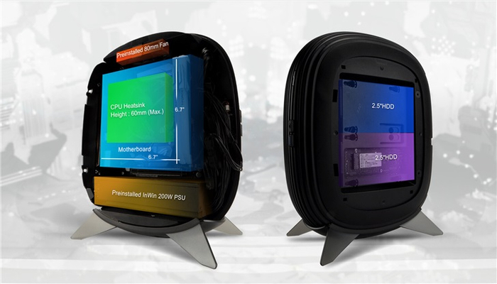IT之家了解到,这款机箱采用了同心圆环层叠设计,中间有空隙,可以帮助散热,空隙也经过了防尘处理。机箱的侧面为钢化玻璃,可以安装两块2.5英寸的硬盘。B1机箱附带一个垂直支架,可以竖放也可以横放。迎广B1机箱的尺寸为108×302×238mm,CPU散热器的最大高度支持到为60mm。