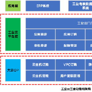 工业云市场主要分为应用层、工业云平台层以及大云OP三个部分。其中,应用层管理部署在云上的各种工业应用,包括应用的配置、应用的上架与下架等;工业云平台层主要指工业云门户,主要功能及模块包括应用商店、应用订购、应用开通、应用监控、虚机申请、配额管理、应用一键部署以及应用镜像管理等;作为工业云平台和移动云的中间层,工业云平台通过大云OP来实现对移动云资源的使用和管理,包括云主机订购、VPC订购、弹性公网IP订购、IP资源绑定、云主机管理、用户配额管理、镜像管理以及资源退订等。