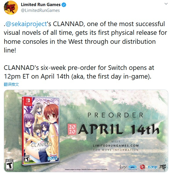 IT之家4月10日消息 据Limited Run Games官推,Key社名作《CLANNAD》将限量发行Switch实体标准版和典藏版卡带。