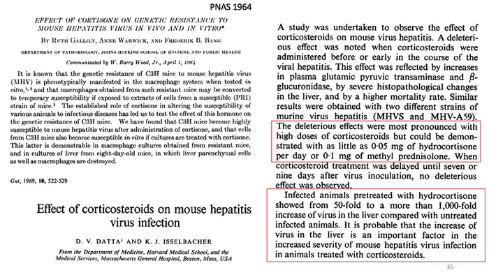 再讲激素,激素对冠状病毒的作用很久之前就有很好的研究。1964年发表于PNAS的工作发现老鼠或者细胞不能被小鼠肝炎病毒感染的,如果给予激素马上就能被感染。1969年发表于Gut的论文从细胞水平到动物水平都进行了非常细致的研究。我想提醒大家注意的是,他们看到高剂量类固醇促进病毒复制并增强病理反应的效果最强,但即使每天仅使用低剂量的0.05mg氢化可的松或者0.1mg的泼尼松龙仍然可以看到对病毒复制的刺激效应。类固醇的使用能刺激病毒复制50到1000倍。对于SARS-CoV,当年香港总结的经验也是认为类固醇使用会造成更多的死亡,而且病情也更严重。对于MERS的研究也清楚表明类固醇会延长病毒的清除。