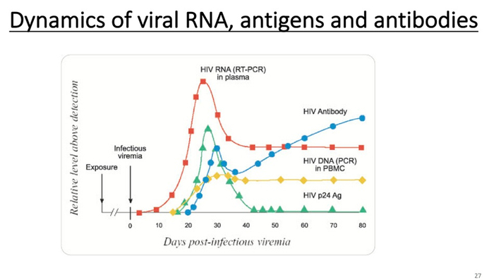 这个是说明核酸抗原抗体的变化,我们拿HIV为例,它的RNA是红色的峰,抗原是绿色的峰,抗体是蓝色的峰。