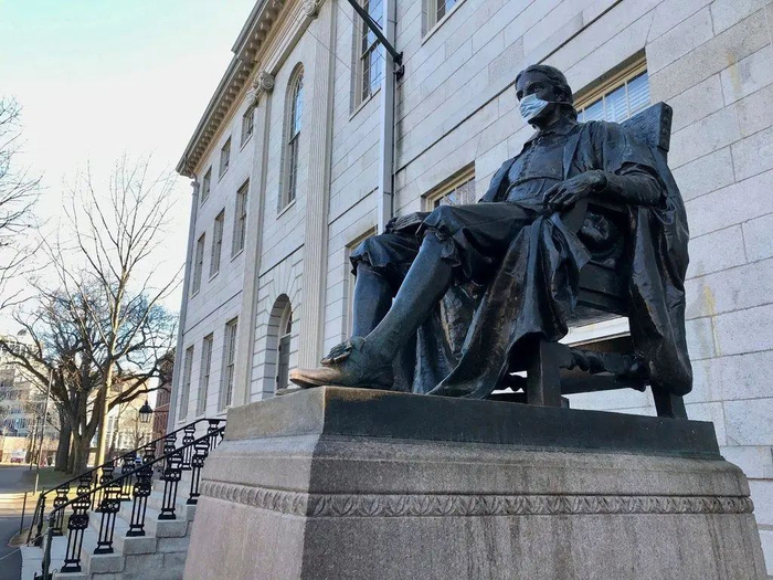 疫情期间,哈佛大学标志性雕塑“三谎雕塑”被戴上了口罩。图据《哈佛公报》