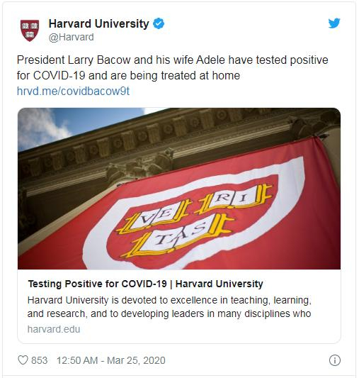 哈佛大学官方推特发布校长与妻子确诊新冠肺炎的消息。图据推特