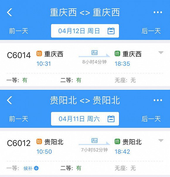 今天(4月10日)早上8点10分,C6017次列车从成都东站发出,在途径重庆西、贵阳北之后,将于下午16点19分重新回到成都东站。这是中国铁路成都局集团有限公司(下称成都局集团)开行的环形动车线。