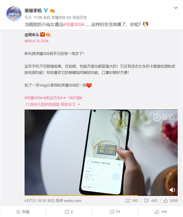@周米儿评价,荣耀30S除了在拍照、颜值、性能方面表现强大之外,还有适合女生的卡路里检测和皮肤检测功能。