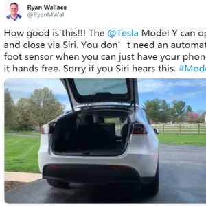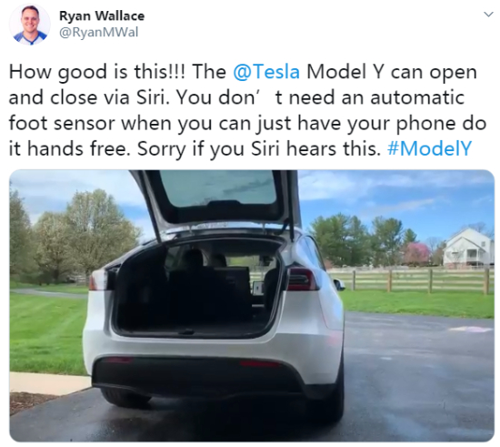 近日,特斯拉Model Y车主Ryan Wallace在个人Twitter上发布了一段视频,展示了利用苹果手机软件和Siri打开后备箱。
