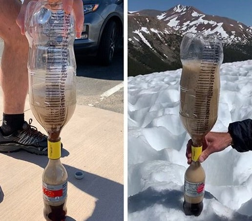 加入曼妥思后:“沸腾可乐”现象在高海拔山顶更加戏剧化