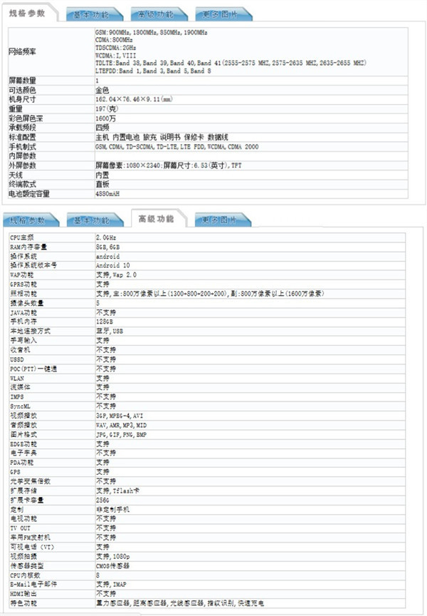根据工信部的信息,vivo的这款新机搭载了一颗主频为2.0GHz的处理器,有6GB和8GB两种运存规格可选;采用一块6.53英寸的挖孔屏幕,分辨率为1080×2340;内置一块4880mAh容量电池,最高支持18W速度快充;机身尺寸为162.04×76.46×9.11mm,重量是197g。另外,该网站还公布了这款手机的摄像头参数,前置为一枚1600万像素的自拍镜头;后置四摄模组,分别由1300万像素镜头+800万像素镜头+200万像素镜头+200万像素镜头组成。