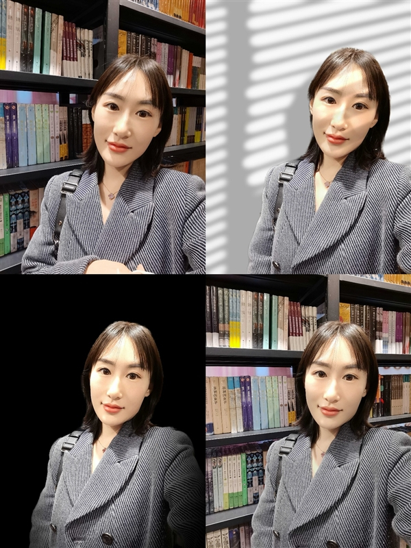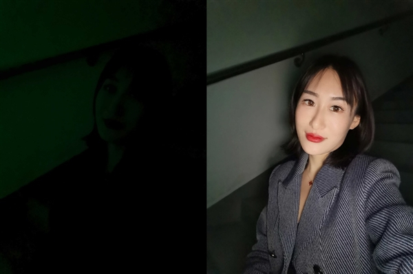 上图中小姐姐在昏暗的楼道里做了试验,左边是原始情况下的自拍,几乎是漆黑一片,完全没可能自拍,右边则是开了超级夜景自拍,屏幕也可以充当闪光灯被人像补光,同时自动检测光线,将人物与背景AI分离,再通过多帧合成、定点曝光增强等算法,最终拍出了一张美美的夜景自拍照。