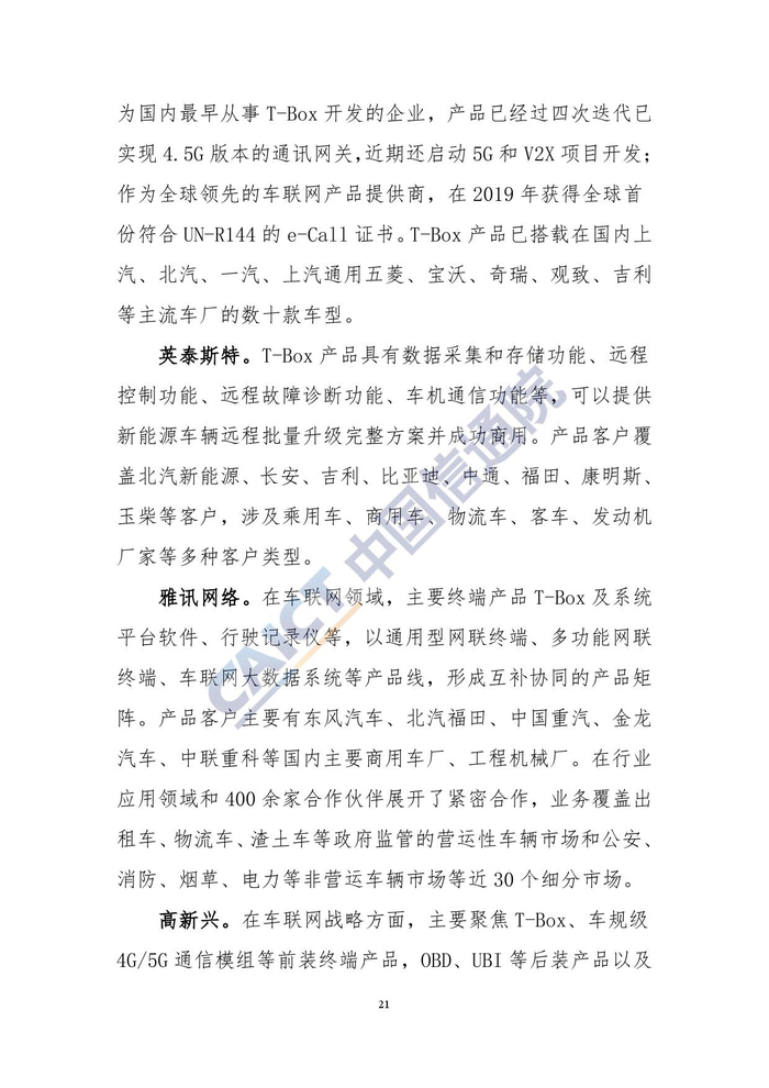 同时,T-Box作为智能网联汽车应用场景实现的重要硬件基础需提前布设,未来有望成为智能网联汽车标配并率先放量。本研究在车联网整体发展研究的基础上,进一步聚焦热点研究领域,开展车载智能终端的研究,基于对网联车发展、车载智能终端市场规模、前装率等的分析,从企业的视角对T-Box市场的基本情况进行分析,聚焦市场份额领先的慧翰以及有代表性的相关企业的发展情况,并探讨车载智能终端市场发展趋势。