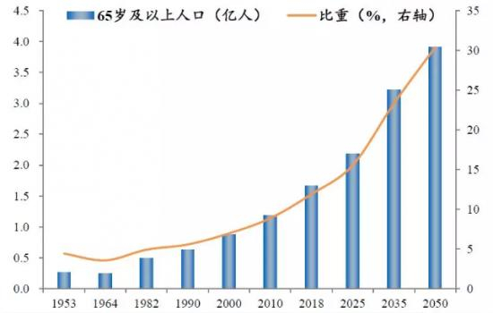 根据恒大研究院任泽平的测算模型,预计中国将于2023年前后进入深度老龄化社会,再10年后即2033年前后进入超级老龄化社会,2050年达30.0%,而且由于人口基数大,中国老年人口规模也是前所未有。