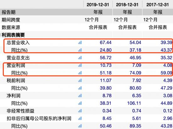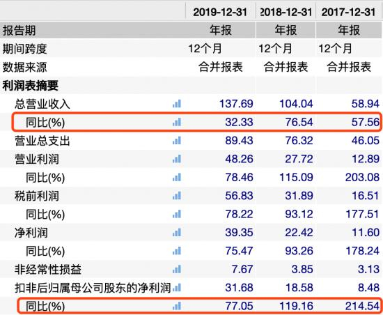 2019年,国产奶粉中主打高端品牌的中国飞鹤营收规模最大,达到了137亿元,同比增长32.33%,而2017年和2018年该公司的营收增长也分别达到了57.56%、76.54%,保持高增长状态,并且营业利润的增长速度远超过了营收增长速度。