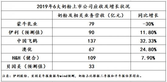 截止2020年4月9日,在港A两地上市的6家国产奶粉公司中,有4家公司披露了2019财报,分别是中国飞鹤、蒙牛乳业、澳优、H&H国际控股,其中伊利股份和贝因美未披露数据,我们根据半年报和三季度做同步测算,选取了wind提供的大致预测数据。