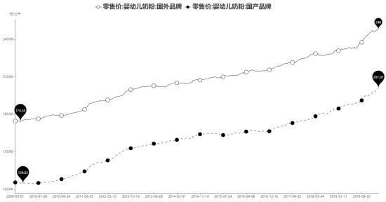 2018年,国产奶粉市场份额仅仅为43.7%,而且在价格上,国产奶粉品牌的价格整体也要低于国外品牌,近些年的价差一直在45-50元/千克之间波动。