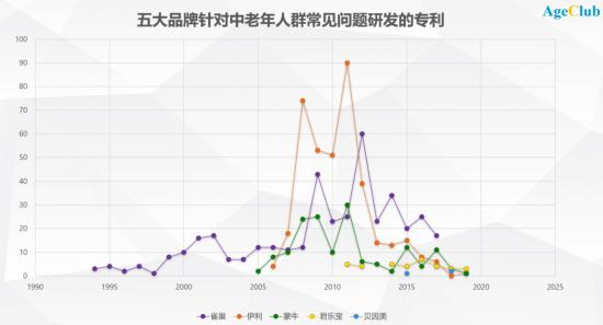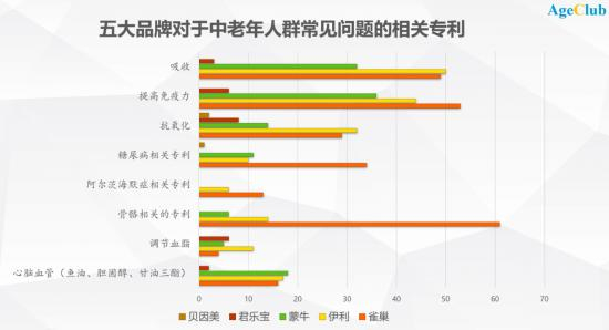 五大奶粉品牌在吸收、提高免疫力、抗氧化、骨骼、调节血脂、心脑血管方面的专利最多,未来在这几个细分方向的中老年奶粉可能竞争相对更激烈。