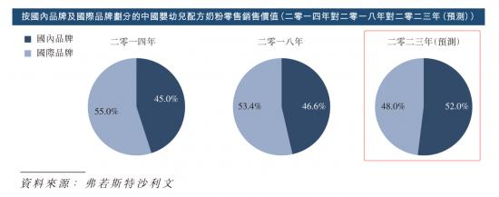 根据弗若斯特沙利文的报告,从整个市场规模上来看,2018年中国婴幼儿配方奶粉的市场为2450亿元,预计到2023年增加至3427亿元,复合年增长率为6.9%,从市场占有率来看,预计到2023年国内品牌的市场占有率将达到52%。