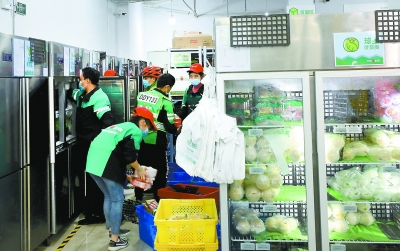 仓库内忙忙碌碌。4名分拣员的手持终端会收到客户下单提示,他们按提示信息选取海鲜、肉类、蔬菜,打包完成后交由12名骑手配送。