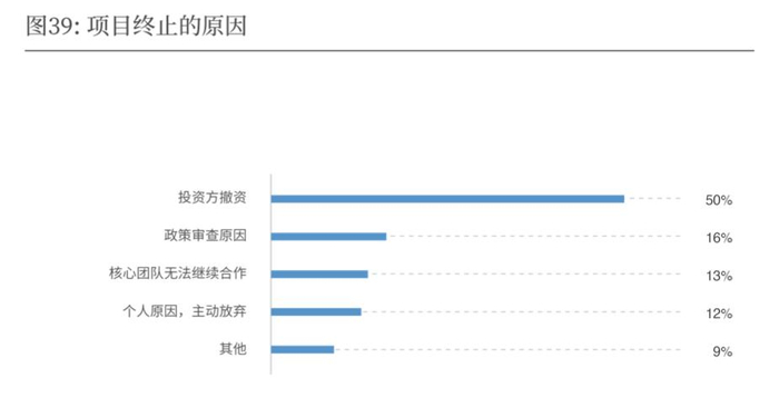 影视行业的高风险早已人所共知,64%的受访导演曾遭遇项目终止,究其原因,有半数都是投资方撤资。有些则是和投资方或核心团队产生了创作上的分歧。