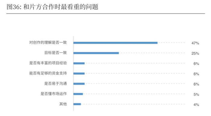 关于创作主导权,导演中心制似乎已经渐渐松动,有52%的人认为归属于导演,44%的人则认同导演与制片人都是创作环节中的关键人物,具有同等重要性。