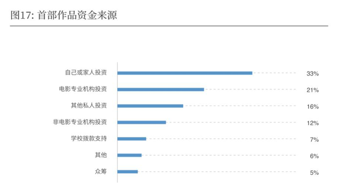 电影长片除了对创作者及其团队的高要求,更多的困难也许来自资金。受访导演在拍摄处女作时,最大的资金来源还是靠自己和亲友筹资,也有两成人是在各类创投活动和青年导演扶持计划中获得资金支持。访谈中我们也发现,不少优秀的青年创作者都是在各类创投和扶持计划中脱颖而出,进而正式走上导演之路。
