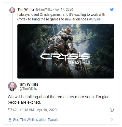 Tim Willits称Crytek和Saber Interactive将在近期公布更多关于《孤岛危机:复刻版》的细节内容。