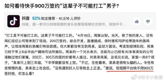 快手回应900万签约“这辈子不可能打工”男子:没有签约周某人